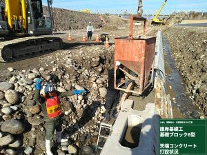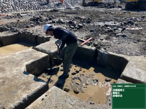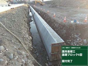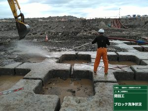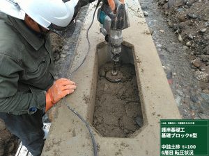 既設護岸の根固めブロック(十字ブロック)の間の土砂をバックホウ及び人力にて掘削することです。