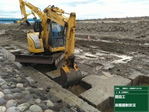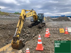 ICT仕様のバックホウを使用して床掘掘削を行いました。