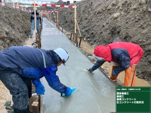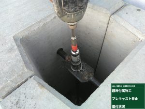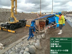 ジョイントを連結金具で固定した後、中詰コンクリート打設します。最後に巻止の埋戻しをして完了です。