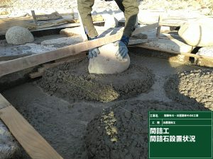 胴込めコンクリートを打設します。目地深さ9センチになるように目安棒で確認しながらコテ仕上げ、掃除していきます。