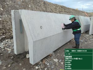 7/29から根固めブロック製作を開始しました。製作数は6tのエックスブロック186個、8tの六脚ブロックが60個を9月中旬頃まで製作を予定しております。根固めブロックを設置することで、洗掘を防いで河川を守ります。