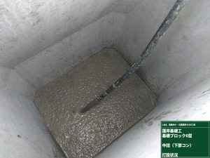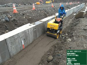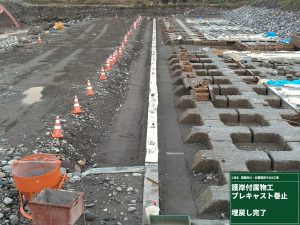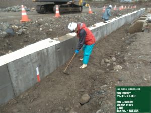 据付完了後、下部コン20㎝を打設し、中詰め土砂を法留天端から20㎝下がりまで土砂を入れ、