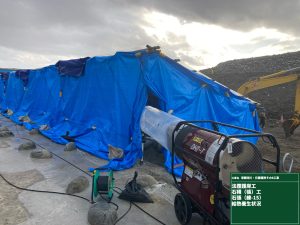 冬の間はコンクリート打設完了後、コンクリートが凍結しないように雪寒仮囲いを設置し、ジェットファーネスにて温風を送り温めます。