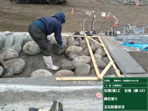 大きさが約45cmの玉石を手で転がしながら法面に配置します、手が滑り落石で人に当たったりしたら大事故です。