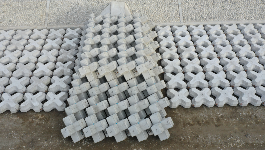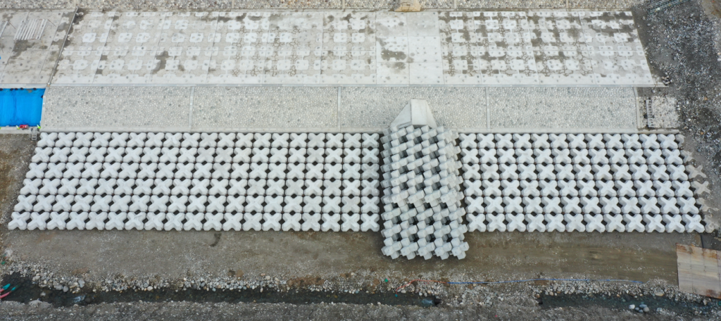 9/22で根固めブロック製作6tのエックスブロック186個、8tの六脚ブロックが60個を製作完了しました。