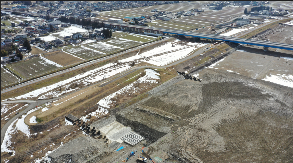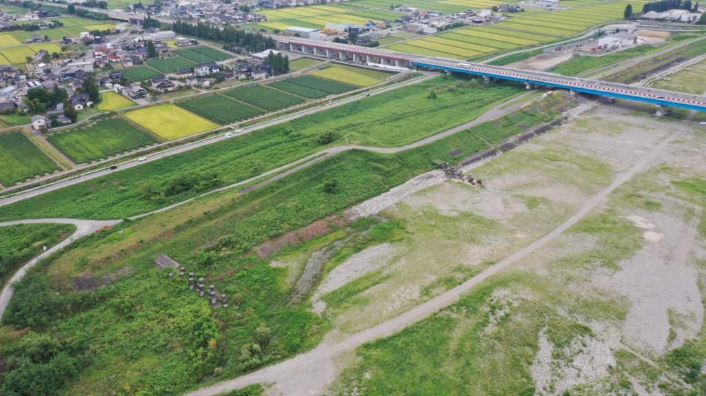 写真の土砂で埋まっていない箇所(写真左下部)は常願寺川・日置護岸その9工事の朝日建設㈱さんのがまだ施工を行っています。