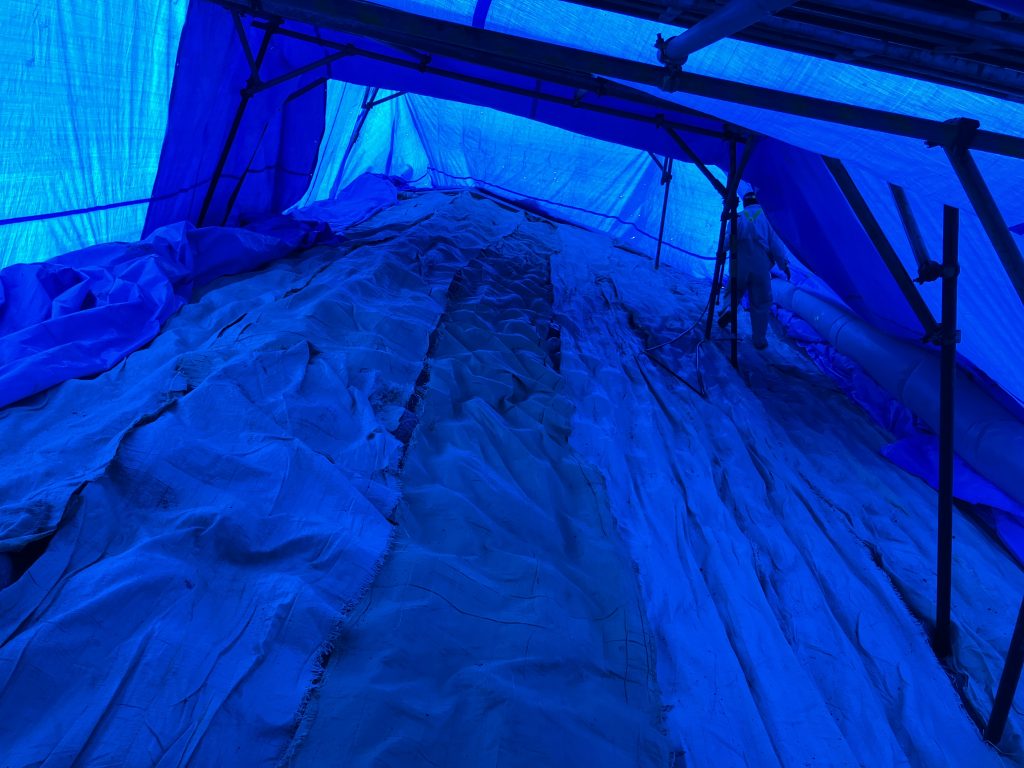 生コンが低温とならないように、あらかじめセットした給熱装置と屋根のあるの囲いを