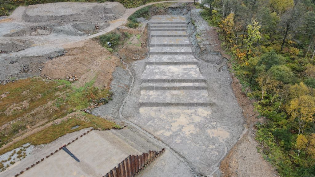 現場では埋戻しが終わった箇所から面を整形し、小段を作っています。