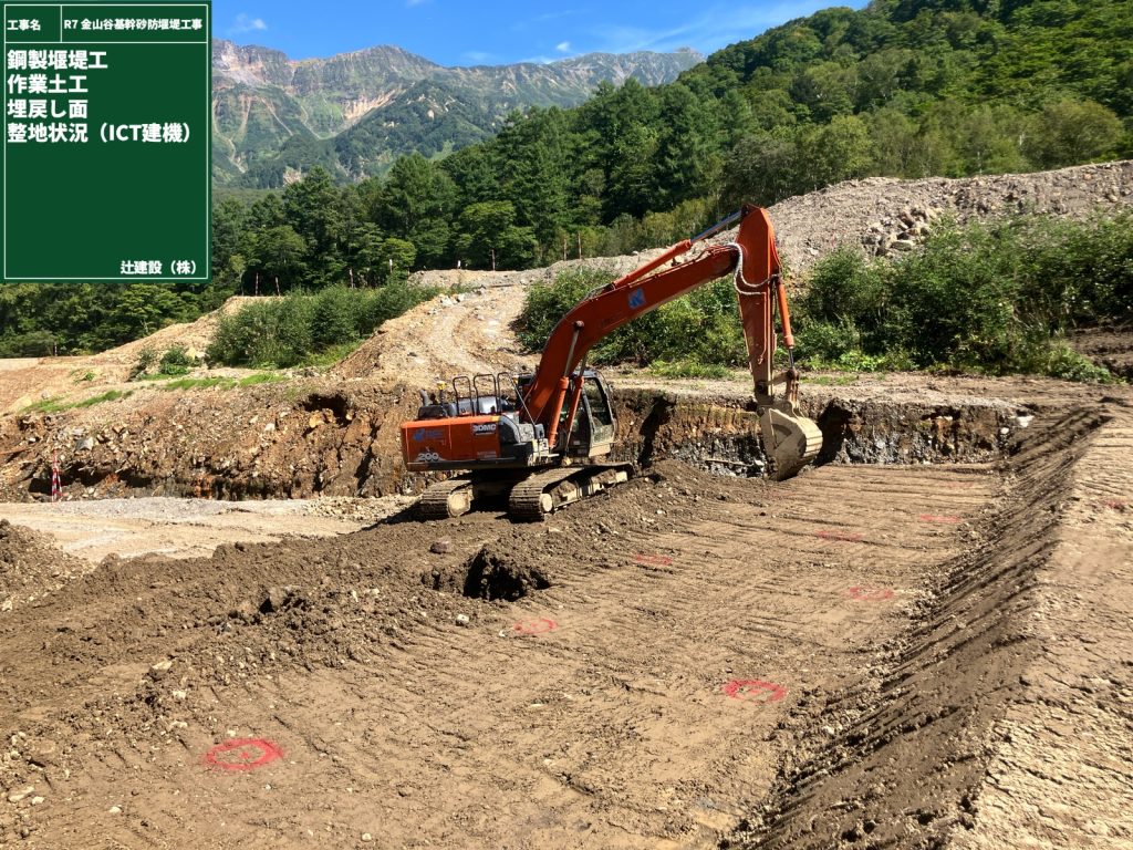 やすく(現場土砂の性質上)、中での作業は危険なのでICTバックホウによる敷