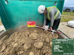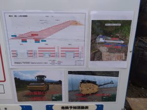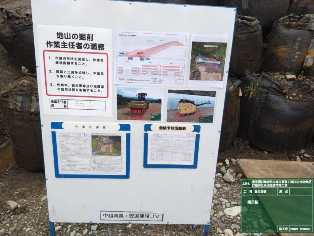 現場に掲示板を設置して、盛土の施工管理や安全管理に