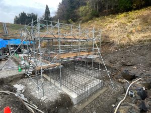 この時期は寒いのでコンクリートが固まりにくくなるので、足場にシートを囲ったり
