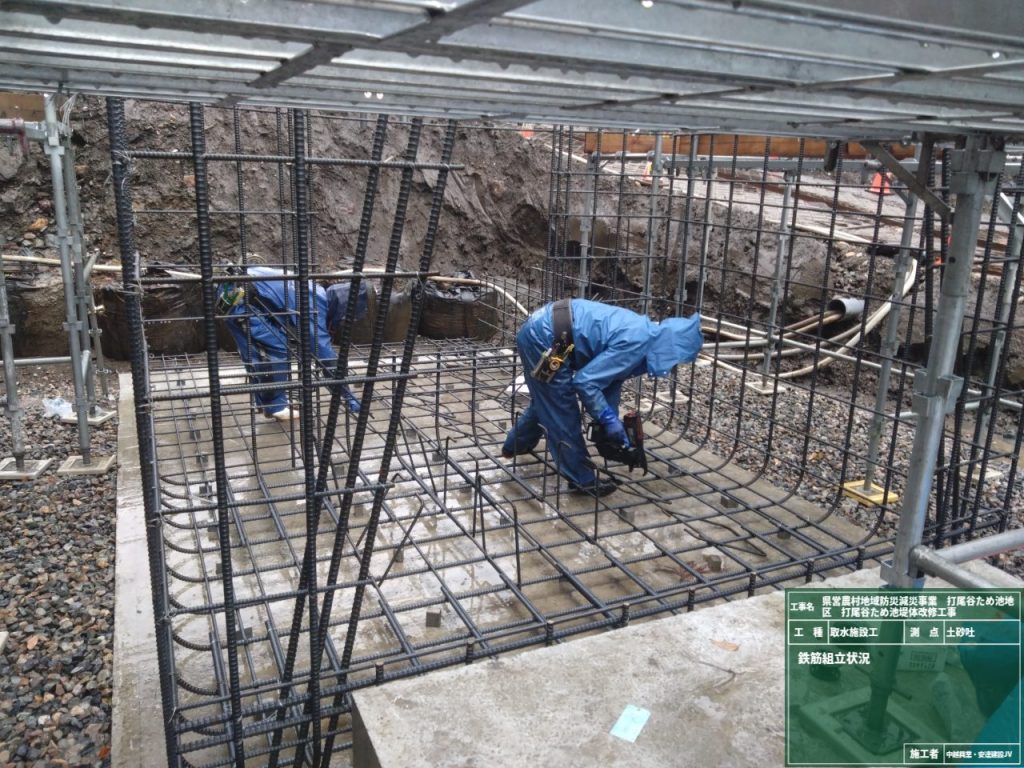 鉄筋を組立ています。1本1本丁寧に図面どおり配置し、結束線
